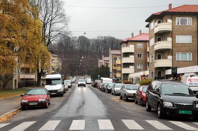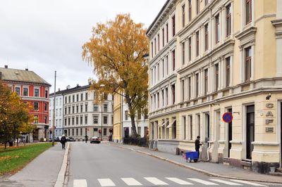 Parti fra Helgesens gate med nr. 78 til høyre, første boligblokk oppført i Oslo etter andre verdenskrig.