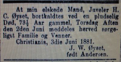 Faksimile fra Aftenposten 3. juni 1881, dødsannonse for Herman Colbjørnsen Øyset.