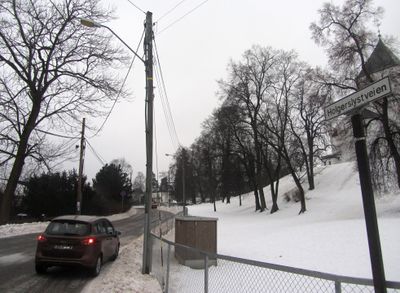 Vintermotiv fra Holgerslystveien i Oslo. Ullern kirke skimtes oppe til høyre i bildet.
