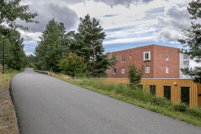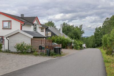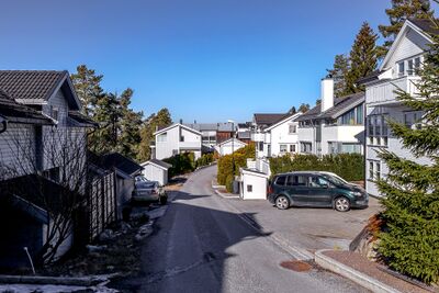 Fra den nordligste delen av Holmsåsen skimter man blokkene i Høgåsveien 56–70.