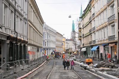 Holtegata sett fra Uranienborgveien. Oppgradering av trikkelinja gjennom Homannsbyen nærmer seg fullførelse. Linja åpnet for trafikk to dager etter.