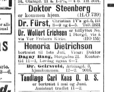 Legepraksisen ble fast annonsert i Aftenposten, og gjennom annonsene får vi spredt informasjon om livet og nettverket hennes. Her ser vi at hun fra 1903 hadde telefon, og at legekontorets åpningstider ble kortere i takt med at hun fikk flere eksterne oppdrag. Annonsene forteller også når hun var på reise, og hvem som stilte som vikar for henne mens hun var borte. Sommeren 1905 og 1906 og våren 1907 var doktor Dagny Bang vikar.[7] De neste par årene vikarierte Louise Isachsen og Kristine Munch, som Dietrichson var i Kvindelige studenters sangforening med. Munch og Isachsen ser vi av Honorias mors etterlatte dagbøker at Honoroia også omgikkes privat.[8]