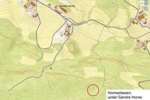 Ut ifra Thorkildsens kartfesting, som trolig bygger på kartet fra 1826, ligger plassen rundt 500 meter sørøst for gårdstunet på Søndre Horne, men det er vanskelig å fastslå den nøyaktige beliggenheten. Det er flere rydningsrøyser her, delvis skjult av vegetasjon, men ingen tydelige rester etter hustufter. Det kan ikke utelukkes at dette området har vært dyrket som en del av «Halvor Fanas plass», og at dette er den «Horneplassen» som har eksistert helt fra første halvdel av 1700-tallet.