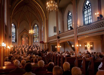 Veslemøy Nystedt Stoltenbergs fire glassmalerier har jul, påske, pinse og ««Det nye Jerusalem» som motiv. De kom på plass i 1990 og 1992. Bombingen 9. april 1940 smadret de glassmalerier kirken hadde hatt fra 1920.