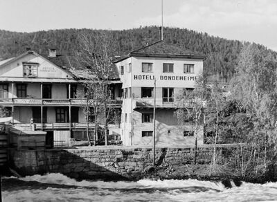 Hotell Bondeheimen på Kongsberg i 1951, beliggende ved Numedalslågen (Nybrufossen).