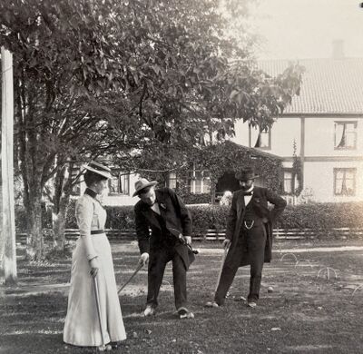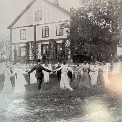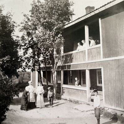Prestegårdsliv på Hov på det sene 1800-tallet. Hovedbygget ses i bakgrunnen.