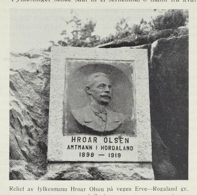 | Fylkesmann Hroar Olsen var en embedsmann av den gamle skole. Ja, han personifiserte denne skoles beste egenskaper. Han tilhørte en høit kultivert slekt, førte selv denne slekts tradisjoner videre, utrustet som han var med solide kunnskaper, med et sikkert judicium, og en rolig, avbalansert dømmekraft, ikke bare i sin embedspraksis, men også når det gjaldt almenmenneskelige forhold og kunst. | ||