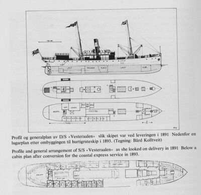 D/S Vesteraalen. Profil- og generalplan ved leveringen i 1891, samt lugarplan etter ombyggingen til hurtigruteskip i 1893.