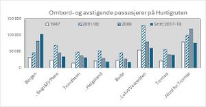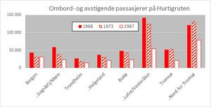 Mens man før krigen hadde årlige passasjertall i underkant av 300.000, vokste dette etter krigen fra 376.563 i 1946 jevnt til 569.579 i 1962. Etter det var antall passasjerer stabilt rundt 540.000 pr år ut 1960-tallet. Trafikken var preget av sterke sesongmessige svingninger. Transportøkonomisk institutt (TØI) pekte i 1966 at tiden for utskifting/ombygging av skipene ville komme utover 1970-årene. Samtidig ville ruten bli utsatt for konkurranse fra nye transporttilbud, både lokalt, regionalt og på hele strekningen. TØI konkluderte derfor med at hurtigrutens fremtid måtte få en politisk avklaring på begynnelsen av 1970-tallet.