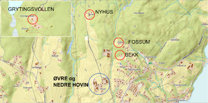 Det er vanlig å regne med at de fire plassene Bekk, Fossum, Grytingsvollen og Nyhus har hørt til Øvre Hovin. Men Øvre og Nedre Hovin har noen ganger hatt samme eier og det kan hende at plassene har vekslet litt mellom hvilken av de to Hovin-gårdene de hørte til. ¨