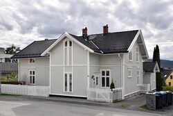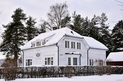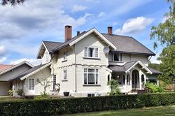| 16 | Gnr. 243/4, «Admini» Oppført i 1906, etter tegning av arkitekt Henning Kloumann på oppdrag fra Sam Eyde og Norsk Hydro i 1905–1906 under ledelse av byggmester A.B. Aarsten. Møbel- og interiørkunstneren John Borgersen (1863–1930) tegnet og laget deler av interiørene og inventaret. Bolig og kontor for Sam Eyde når han var på Notodden. Her ble også den årlige generalforsamlingen på Hydros stiftelsesdag 2. desember avholdt fram til 1960. Også brukt som representasjons- og festlokale. Bygningen ble fredet i 2014. | |