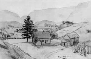 Gården Midt-Røinestad, der hele familien bodde så lenge Ståle Syvertsen Røinestad levde, altså til 1899. Tegningen av gården ble laget i 1923 av Ståles barnebarn, kunstneren Ståle Kyllingstad. Gjengitt med tillatelse av Ståle Kyllingstads sønn, Røyne Kyllingstad, i 2021.
