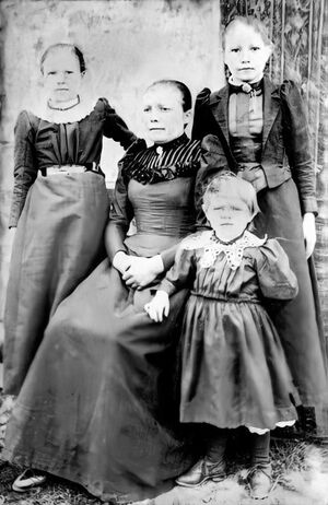Inger, tre år gammel, sammen med moren Elen og sine to halvsøstre, Sara Amalie og Tale Katrine Røinestad. Visittkortbilde. Fotograf: Ukjent. Kvinesdal,1893.