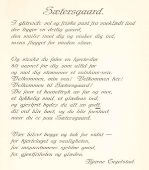 Så ble det i okkupasjonstiden igjen arrangert stevner på Sætersgård, nå nærmest i regi av NS. Quisling var på nytt hovedtaler, både i 1941 og 1942. I 1944 var det Erling Bjørnsons tur. Fra talerstolen på Sætersgård hevdet han at dersom hans far, Bjørnstjerne Bjørnson, hadde stått der da, ville også han ha vært nasjonalsosialist.[9] Ivar Sæter var for øvrig en stor beundrer av Bjørnstjerne Bjørnson. Foran stortingsvalget i 1891 hadde Sæter fått Bjørnson til Tolga, der han holdt tale fra stabburstrappa på Sætersgård, i ettertid kjent som Bjørnson-trappa.[10] Seinere lærte Sæter Bjørnson bedre å kjenne, blant annet fra opphold i Roma.