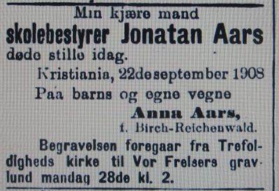 Faksimile fra Aftenposten 27. seotember 1908: Dødsannonse for Jonathan Aars.