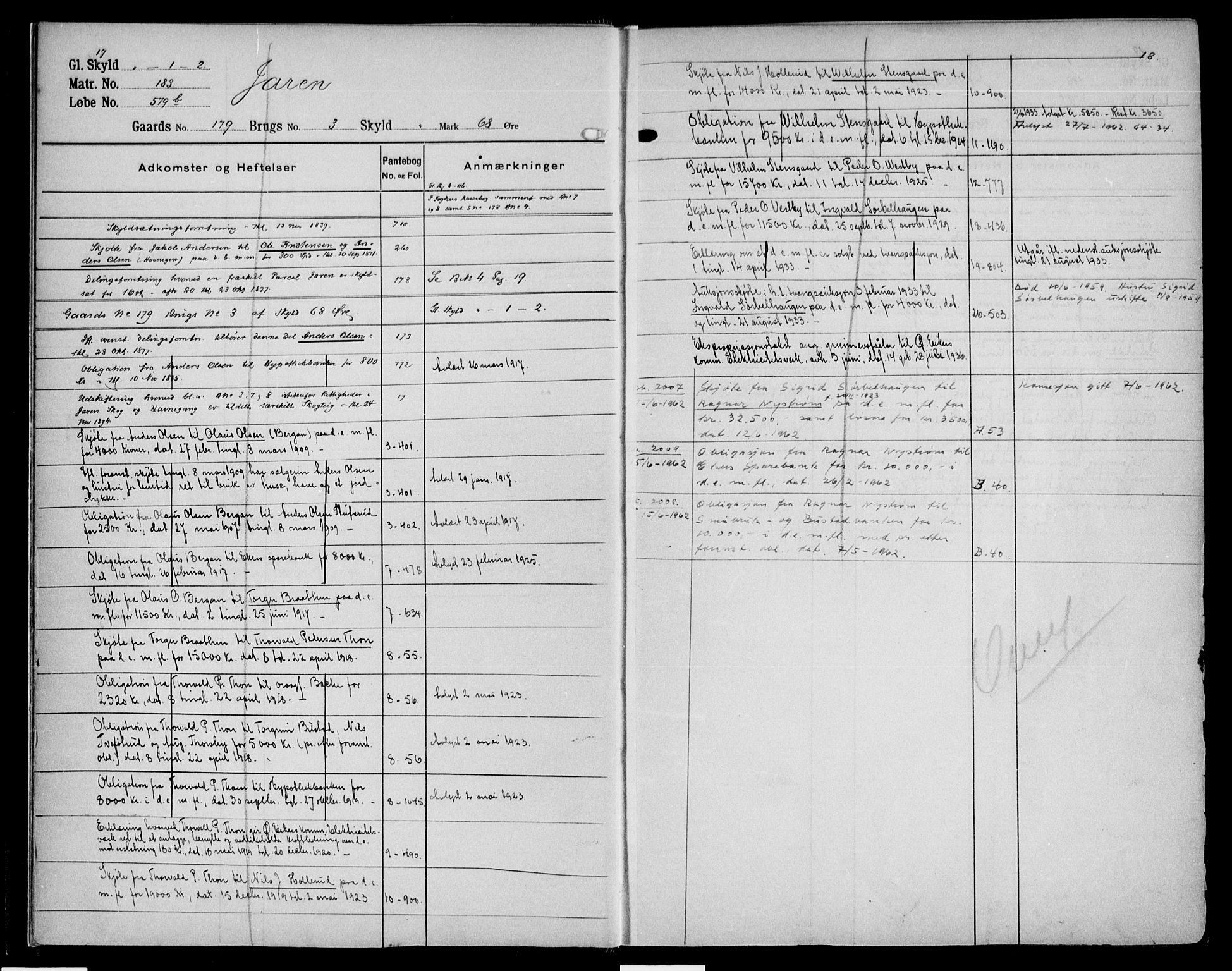 Hans Larsen selger eiendommen til Christopher Hansen i 1850 for 380 spd. «af de i Norges Bank efter obligation datert 14. tgl. 15. november 1832 deponerede sølvspecier samt hans løsøre, for 500 spd og livøre efter nedskrevet contract, dat. 20 september 1848, tgl. 14 mai 1850. Her er også i panteregistrert ført: cfr. skjøde til Hans Larsen på ½ lbt tunge af Jaren, thg. 29. juni 1812 og ditto til samme på 5 lbt tunge af Jaren tgl. 11. mai 1804.»[2]