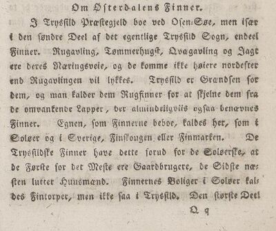 I Tryssild Præstegjeld boe ved Osen-Søe, men især i den søndre Deel af det egentlige Tryssild Sogn, endeel Finner. Rugavling, Tømmerhugst, Qvægavling og Jagt ere deres Næringsveie, og de komme ikke høiere nordefter end Rugavlingen vil lykkes. Tryssild er Grændsen for dem, og man kalder dem Rugfinner for at skjelne dem fra de omvankende Lapper, der almindeligviis ogsaa benævnes Finner. Egnen, som Finnerne beboe, kaldes her, som i Soløer og i Sverige, Finskougen eller Finmarken. De Tryssildske Finner have dette forud for de Soløerske, at de Første for det Meste ere Gaardbrugere, de Sidste næsten lutter Huusmænd. Finnernes Boliger i Soløer kaldes Fintorper, men ikke saa i Tryssild. Den største Deel af de Soløerske Finner boe i Badstuer eller Fin-Koier, de Tryssildske derimod leve i Huse ligesom de Norskes, og have derfor et bedre og sundere Udseende end hine. De fleste Finner ere i bedre Forfatning, end de egentlige Tryssildere, og dette tilskriver man Brugen af deres Braater, hvori de endog høste 16 til 20 Fold; de ere imidlertid ikke saa flittige og heller ikke saa velstaaende som deres Forfædre. Finnerne ere (efter Provst Axel Christian Smiths Vidnesbyrd i top. Journal 23de Hefte) agtværdige, oplyste, godgjørende og føielige Folk. Angaaende den hos dette Folk gjængse Tungsindighed see top. Journal 23de Hefte S. 57.[2]