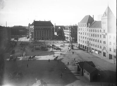 - Jernbanetorget før 1916. Det lave huset i midten er nr. 2, som er erstatta av Den Norske Amerikalinjes bygning.Foto: Narve Skarpmoen (1900–1916).