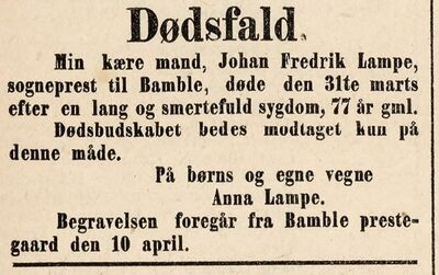 Lampe startet sin geistlige karriere som personellkapellan i Skjerstad i 1836. I Skjerstad var Lampe også ordfører mellom 1838 og 1842. I 1843 gikk turen videre til Lødingen, og også der var Lampe personellkapellan. Sitt første sogneprestembete fikk Lampe i Kolvereid i 1849, og i 1853 ble han utnevnt til prost i Namdalen. I 1856 ble han sogneprest i Tysnes, og hans siste sogneprestembete var i Bamble, der han var fra 1869 til sin død.