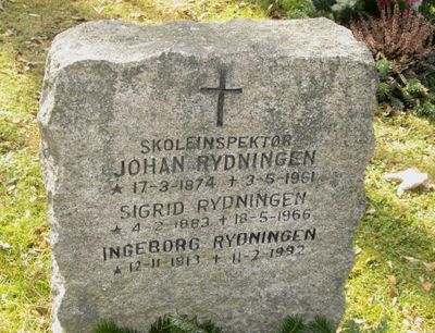 Johan Rydningen er gravlagt på Vestre gravlund i Oslo. Tittelen Skoleinspektør er benyttet på gravminnet.