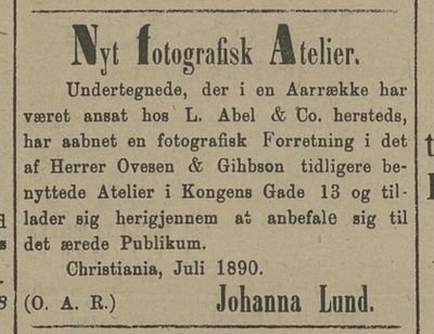 I Kristiania gikk Johanna på Nickelsens Pikeskole og viste der anlegg for tegning. I 1872 ble hun elev hos Louise Abel og overtok i følge slektshistorien om Farsund-Lundene[1] hennes atelier sammen med Sine Kraft. Imidlertid satte hun 6. juli 1890 inn følgende avertissement i Aftenposten: "Undertegnede der i en aarrække har vært ansat hos Hr. Abel & Co. hersteds agter fra 21de Juli førstkommende at aabne fotografisk Forretning i det af Herrer Ovesen & Gihbsson tidligere benyttede Atelier i Kongensgade 13 ...".