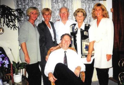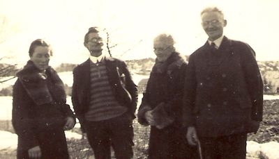 Johannes på besøk i Sandefjord på 1950-tallet. Fra venstre broren Arnoldus´ kone , Hilda, så Johannes´søsken, Arnoldus og Marie, og Johannes selv, helt til høyre på bildet.