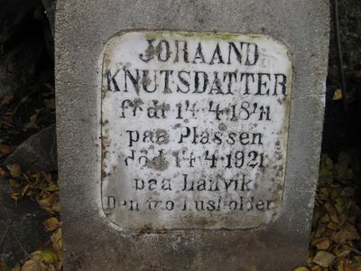- «Joraand Knutsdatter f. 14 04 1841 og d. 14 04 1921».