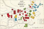 Tilsvarande er bygningane farga etter dei ulike bruka (sjå kart). Det er ikkje lett å sjå noko system. Smiene ligg i utkanten, sikkert årsaka av brannfare.