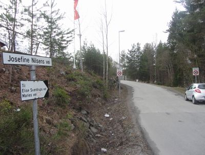 Josefine Nilsens vei på Gamlegrendåsen i Kongsberg går sørover fra Christian Sindings vei til Elise Svedrup vei. Den krysser Maries vei.