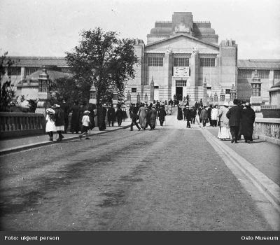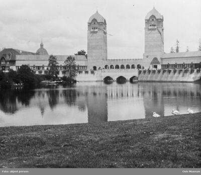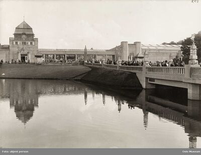 Motiv fra Jubileumsutstillinga 1914. Brua som nå fører til Vigelandsparken ble bygd i forbindelse med utstillinga. I bakgrunnen Industrihallen, en av utstillingsbygningene.
