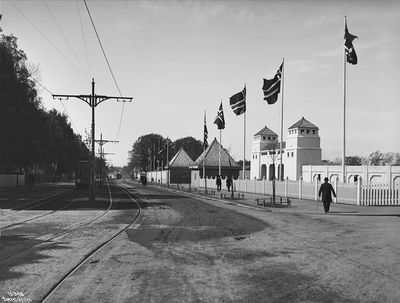 Hovedinngangen, tegnet av Adolf Jensen, sett fra Kirkeveien med den nye trikkelinjen, anlagt i anledning utstillingen.