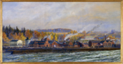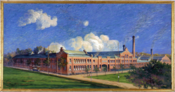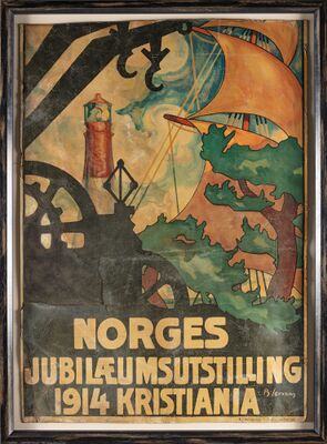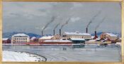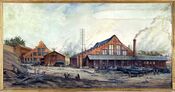 Kunst- og teatermaler Jens Wang malte en rekke store malerier av norske industribedrifter som ble utstilt i Maskinhallen under Jubileumsutstillingen. Mål: lengde 303,0 cm, bredde 153,0 cm.