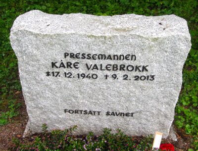 Kåre Valebrokk er gravlagt på Vestre gravlund i Oslo. Tittelen Pressemannen er benyttet på gravminnet, som også har påskriften Fortsatt savnet, valgt av ham selv, og ment som en humoristisk bemerkning til familiens påstand om at han var sjelden hjemme.
