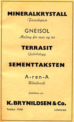 K. Brynildsens fasadepussfabrikk ble opprettet i Fredrikstad i 1937 under navnet Brødrene Brynildsen. Firmaet ble oppløst i 1941 på grunn av vansker med produksjonen under krigen, men ble gjenopprettet i Lillestrøm i 1946. Brynhildsen produserte hussokler, hageurner, gravmonumenter, verandablomsterkasser, portstolper og grå sementtakstein. Produktene ble omsatt over hele landet, og en del gikk til eksport. Bedriften lå på Lillestrøm Cellulosefabrikk AS sitt område.