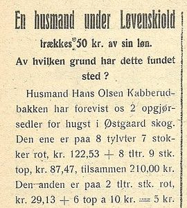 Ole Eriksen døde 1908, og de to yngste sønnene – Hans og Johan - overtok Kabberudbakken. I tillegg til å drifte plassen var de skogs- og jordarbeidere for gårdeieren på Overud. I 1921 var det Thorvald Løvenskiold, og forholdet skulle ha vært gjensidig godt. Like fullt fant den trauste husmann Hans seg nødsaget til å gå til lokalavisa etter at skogsbestyreren hadde trukket 20 prosent av lønna. Dette skulle være en «straff» for at han hadde kjørt et tømmerlass utenom en myr.
