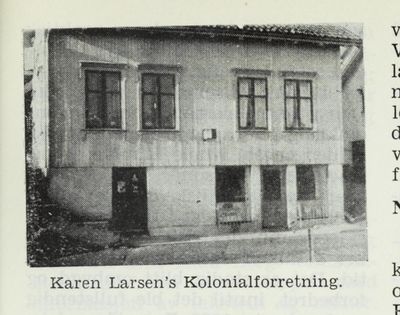 Kolonialforretninga blei starta av John Larsen i 1915. Same året døyde John, og Karen Larsen tok over drifta av forretninga. Karen var kona til John. Firmanamnet blei endra til Karen Larsens Kolonialforretning i 1930. Kva forretninga heitte før dette er usikkert. Forretninga selde både kolonialvarer og manufaktur og heldt til i eigen forretningsbygning.