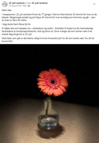 - ↑ 22. juli-senterets bursdagsblomst til Karin Elena Holst 18.08.2022.
