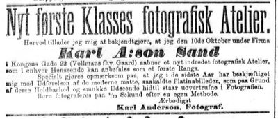 Ved folketellinga 1900 var Karl Anderson bosatt i Hegdehaugsveien 32. Han var gift med Signe Anderson (f. 1874 i Skoger). Hans yrke var oppgitt å være sjef i fotografisk forretning. Han tilhørte Svenska kyrkan. En Erik Lysgaard Thomle er oppgitt å være barn i husstanden, men verken Karl eller Signe Anderson var gamle nok til at han kunne være deres sønn. Den nitten år gamle sjømannen var nok bare en leieboer. Ved folketellinga 1910 bodde han i Bjørn Farmandsgate 16, nå sammen med ei kone ved navn Ragnhild Anderson (f. 1879 i Kristiania). Yrket er nå oppgitt å være hoffotograf.