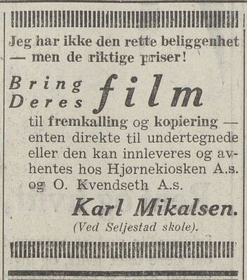 Forretningen til Mikalsen, som også førte kioskvarer, var i bolighuset hans like sør for Seljestad skole. Huset står ennå (i 2014).
