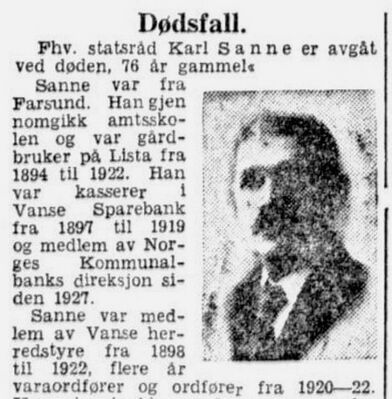- Aftenposten 30. juni 1945, nekrolog over Karl Sanne.
