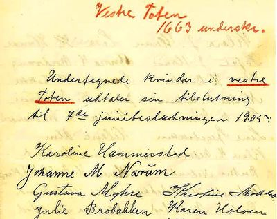 - Stortinget.no.: Underskriftslistene fra Vestre Toten i 1905