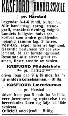 Deretter fulgte ”Kasfjorden kursus for optagelse i lærerskoler og underoffiserskolen”. Skolevirksomheten i Kasfjord omfattet våren 1907 følgende muligheter: