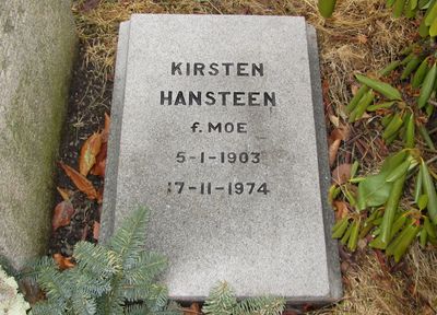 Kirsten Hansteen, som var født i Lyngen som Kirsten Landmark Moe, er ved folketellingen for 1910 oppført i Kristiania, på adressen Jacob Aalls gate 47, sammen med moren og fire søsken. Moren var blitt enke i 1907.