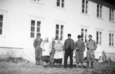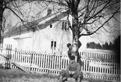 I si’ebygningen der vi bodde var det bære en inngang, kjøkkeninngangen. Overbygget over gangen hadde flistak og gnistregnet sto inn over gardsplassen og begge bolighusa. Noen tog vassbutten som sto ved kjøkkentråppa våres og slengte vatnet over flistaket, men det var altfor farlig å væra her. Vi måtte ut derifrå, jinta vår og je. Je vet itte å lang ti det gikk, men ‘n Harald (broren) kom og fekk øss inn i Pobeda’n sin og kjørde øss bort ifrå gard’n og bortått a Ottine Aas i Torsgard i skogkænten mot Elvsrudbuttikken.
