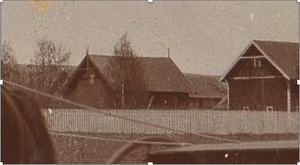 Dette bildet er et kraftig forstørret utsnitt av bildet "Nikolai som såmann" ca 1910. Bildet er tatt fra Herset-åkeren i retning mot nord-øst. Midt på bildet ser vi den nybygde potetbua, og til høgre er låven fra 1865. Det jeg vil vise med bildet, er det gamle fjøset som vi skimter bak potetbua. Dette er det eneste bildet jeg vet om som viser det gamle fjøset fra denne vinkelen. Det er ikke mye av bygningen vi ser, men sammenholdt med det forrige bildet kan vi få et bedre inntrykk av hvordan fjøsbygningen tok seg ut mot tunet.