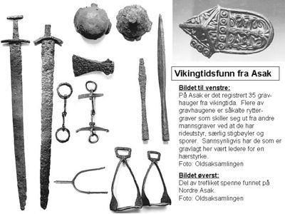 Gravfeltet og andre kulturminner på Asak ble kartlagt og dokumentert av Akershus fylkeskommune i 2004. Det ble registrert 35 gravhauger fra vikingtida i området. I disse haugene og ellers på Asak er det opp gjennom mange år funnet store mengder av gjenstander. Funnene er oppbevart på Oldsaksamlingen. Flere av gravhaugene er såkalte ryttergraver som skiller seg ut fra andre mannsgraver ved at de har rideutstyr, særlig stigbøyler og sporer. Sannsynligvis har de som er gravlagt her, vært ledere for en hærstyrke.