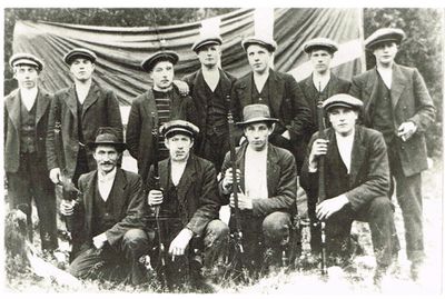 Austbygde Skyttarlag bilde tatt rundt 1912-15. Bakre rekkje frå venstre Jon O. Gollemogen, Herbjørn E.Fossheim, Jon O.Skifterud, Ola O.Kvistrud, Ola O. Rue, Ola K.Olesrud, Gregar G.Eggerud/ Sanderud Fremste rekkje frå venstre Søren Svimbil, Øystein K. Haukaas, Ola T.Dale, Hans Rue Spånem.