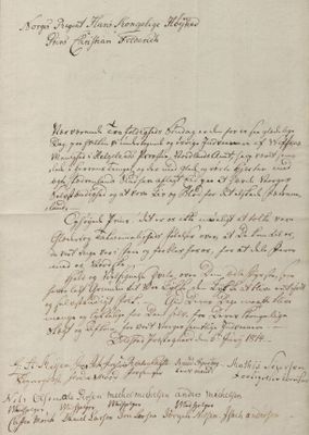 - ↑ Bergsgård, Arne, «Valadressene til Christian Frederik», i Historisk tidsskrift, 33, 1943–1946. Jæger, Tycho C., «Valgene til riksforsamlingen», i Historisk tidsskrift, (3), 1916. Nielsen, Yngvar, Christian Frederik og valgene til Eidsvoldsforsamlingen, Kristiania 1915.