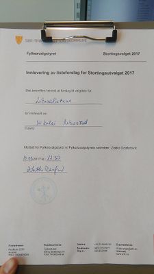 • Roald Ribe: #9 Buskerud, #6 Finnmark, #7 Hedmark, #5 Nordland, #1 Oslo, #10 Sogn og Fjordane, #16 Sør-Trøndelag, #4 Telemark, #12 Vestfold (9 valglister)
