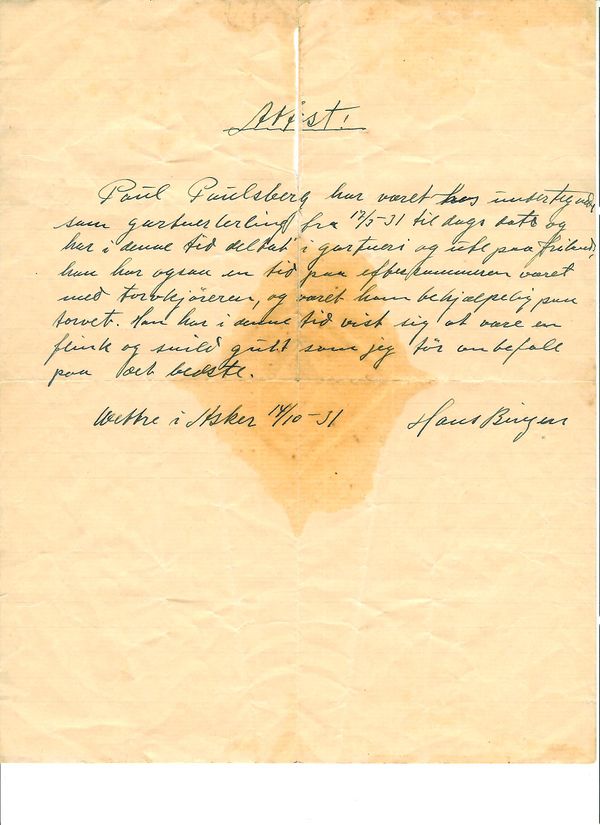 Paul Paulsbergs attester fra ulike gårds- og gartnerjobber på Østlandet 1928-1931, blant annet i Asker, Bærum og Eidsberg. Dette er jobber han hadde før han giftet seg og kjøpte bruket Paulsberg ved Gjøvik.